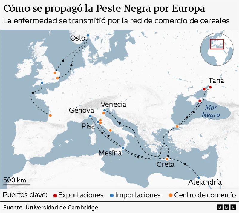 Para evitar la hambruna, las populosas ciudades-estado italianas se vieron obligadas a importar granos de las zonas que rodean el mar Negro, lo que trajo consigo pulgas portadoras de la peste que también transmitieron la enfermedad a Europa.